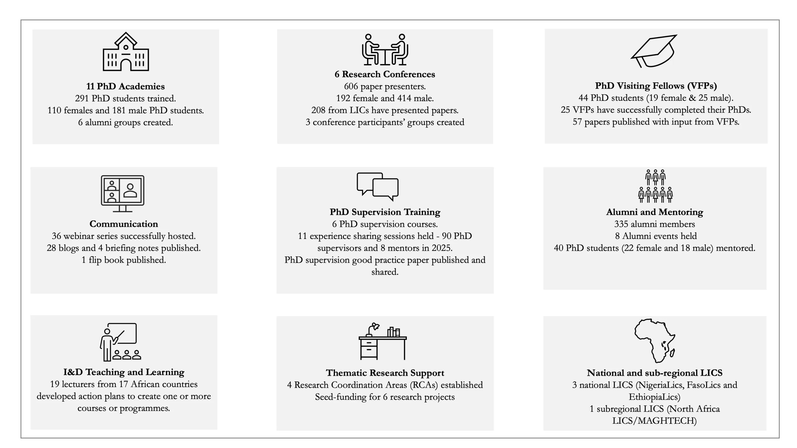 This page is designed to showcase our measurable outcomes, highlighting ways in which our work has contributed to building research capacity in the field of Innovation and Development and contributed to the development of robust innovation systems and generating socio-economic impacts. Through comprehensive data, success stories, and testimonials, we aim to demonstrate how AfricaLics is fostering a culture of learning, collaboration, and change across Africa.